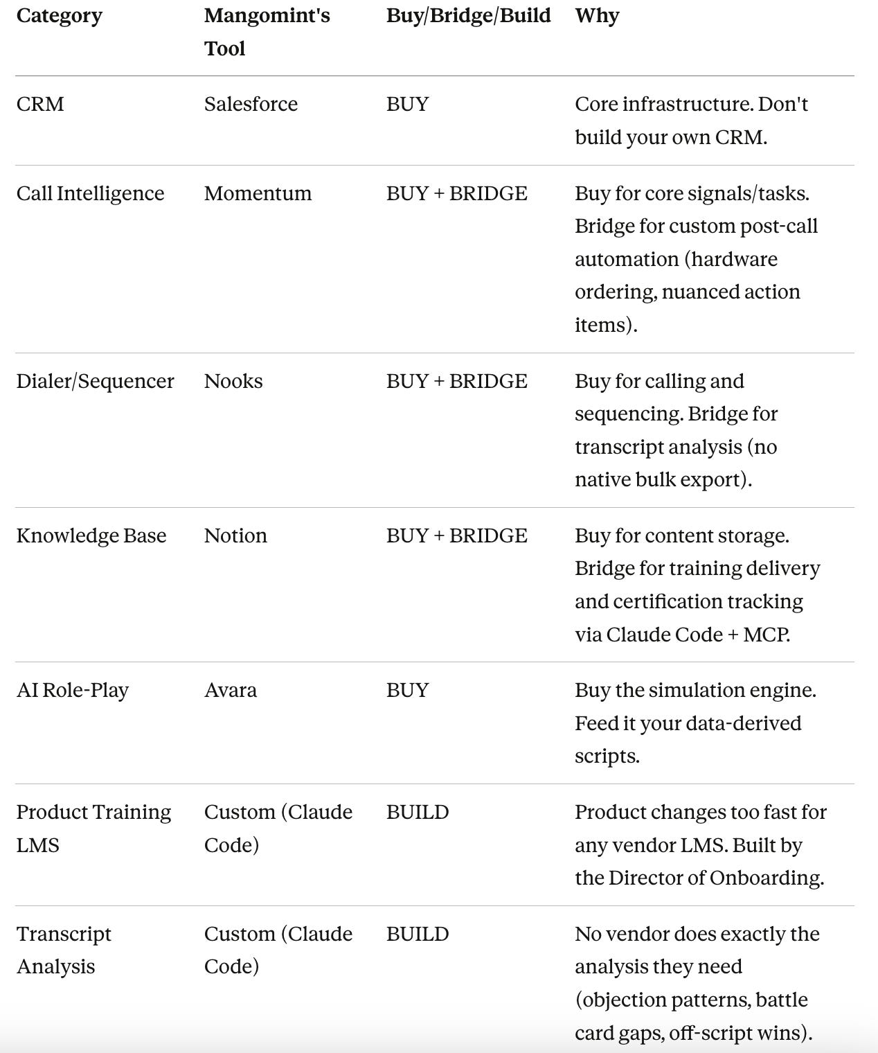 BUILD: Create a custom solution using AI tools like Claude Code. This is the right call when the problem is unique to your business, changes frequently, or sits in a gap no vendor covers. Marchelle’s team built a custom LMS because Mangomint’s product changes too fast for any off-the-shelf LMS to keep pace. That’s a build.