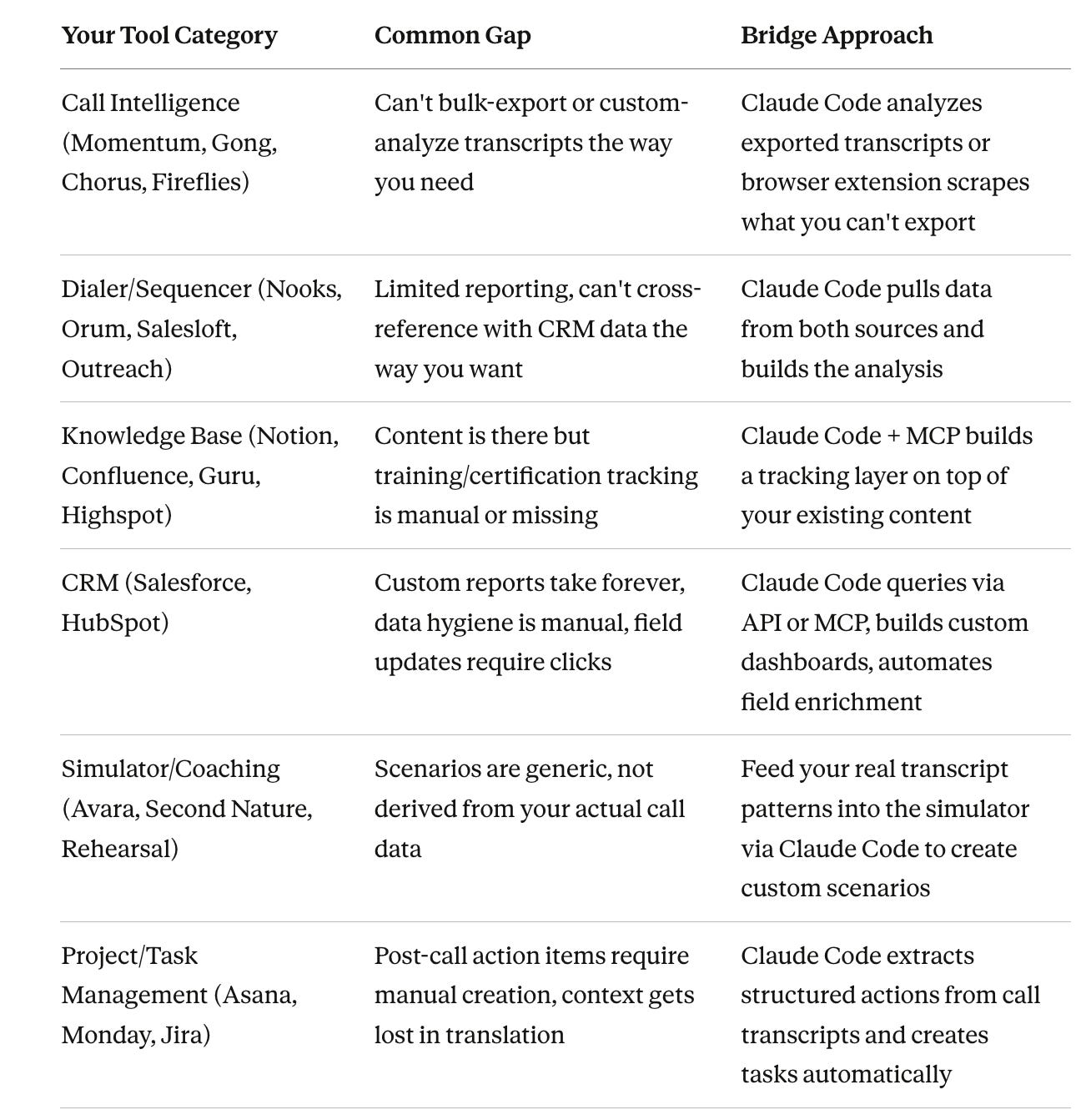 For a RevOps Leader: “I can’t get the data out of Tool A in the format Tool B needs.” That’s a bridge. Claude’s browser extension or Claude Code can extract, transform, and load data between tools that don’t natively integrate.