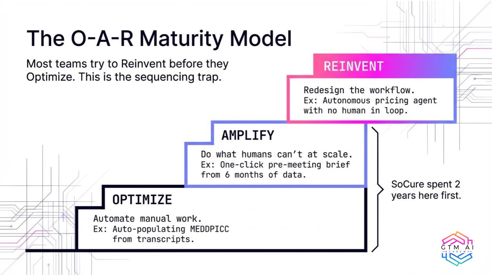During the podcast, we discussed the O-A-R framework from Coach K’s GTM AI Academy that I teach during the AI Strategy Class with Sales Assembly: Optimize, Amplify, Reinvent. Colin placed Socure’s current work “between O and A,” which is exactly the right self-assessment. Most teams overestimate their maturity. Here’s the honest breakdown: