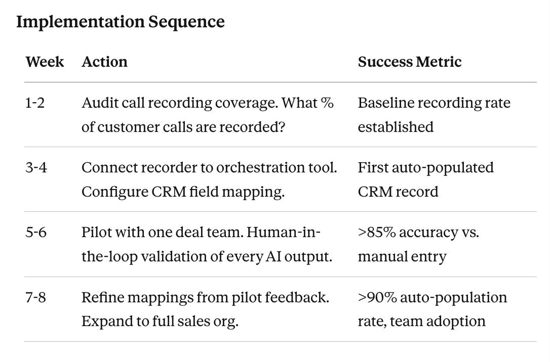 WeekActionSuccess Metric1-2Audit call recording coverage. What % of customer calls are recorded?Baseline recording rate established3-4Connect recorder to orchestration tool. Configure CRM field mapping.First auto-populated CRM record5-6Pilot with one deal team. Human-in-the-loop validation of every AI output.>85% accuracy vs. manual entry7-8Refine mappings from pilot feedback. Expand to full sales org.>90% auto-population rate, team adoption