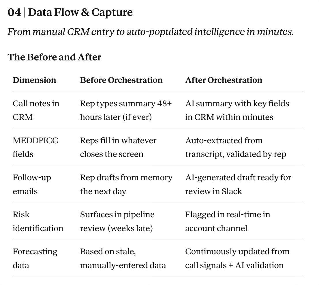That last sentence is the thesis of this entire playbook. When the orchestration layer works, the meetings, the “can you loop me in?” messages, the 48-hour delays on call notes, the stale CRM data that torpedoes your forecast: all of it evaporates.