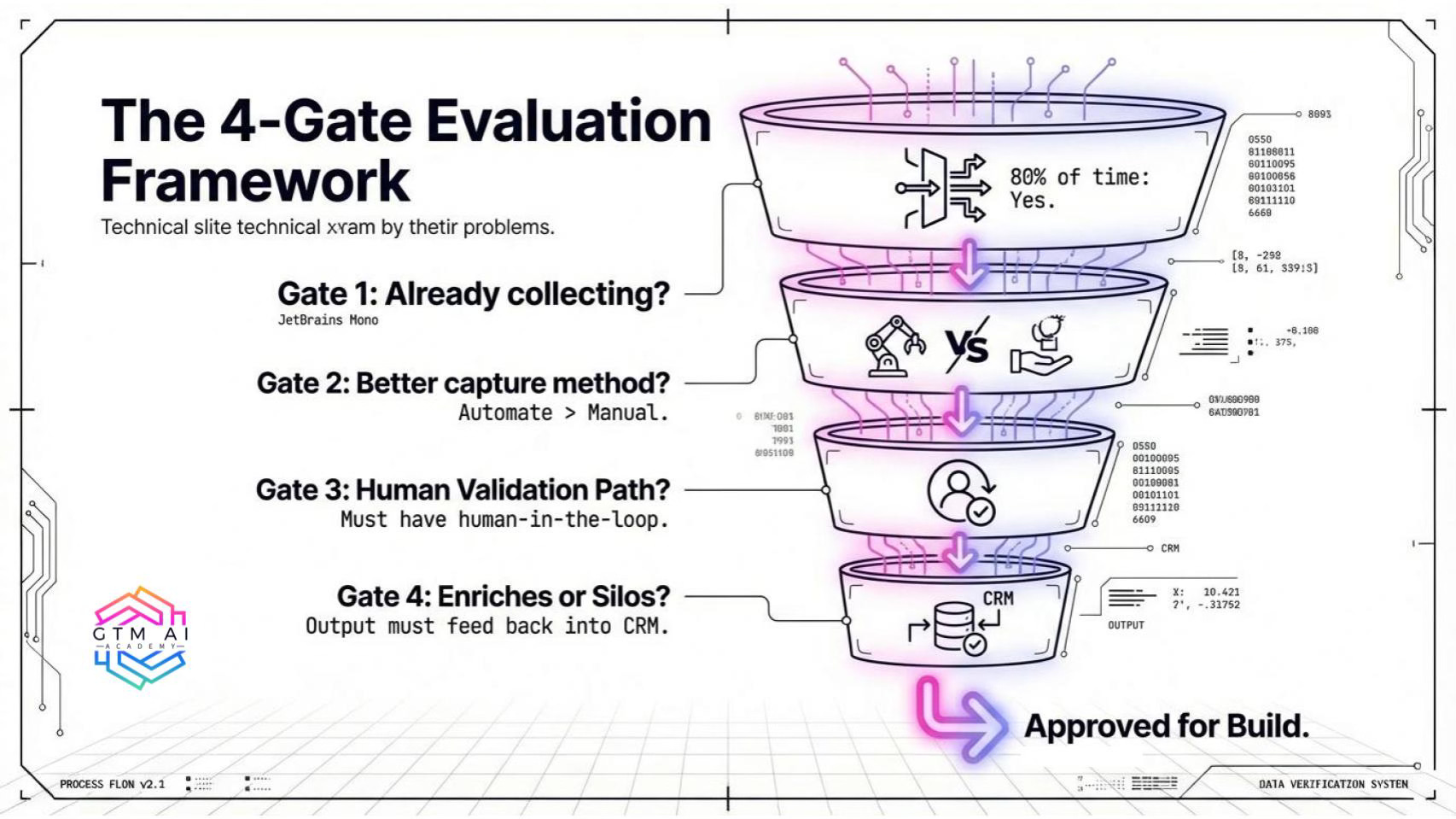 Gate 4: Does this enrich existing systems or create a new silo? Output should feed back into CRM and orchestration. Standalone tools nobody checks = wasted budget.