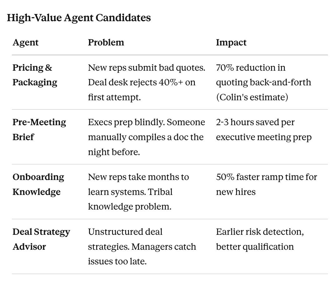 Their next build reflects this: a pricing and packaging agent that enforces quoting guardrails for new reps. Instead of deal desk rejecting bad quotes five times, the agent catches errors before submission. Colin estimates 70% reduction in quoting back-and-forth for new hires.
