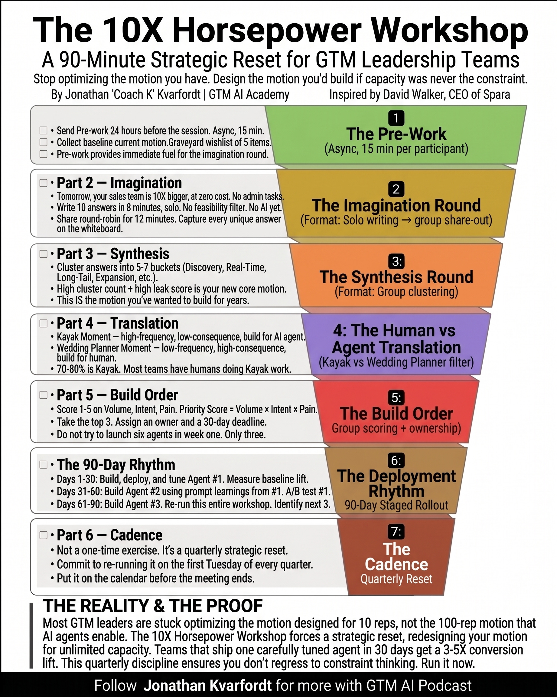 Every quarter, capacity unlocks somewhere — a new agent ships, a manual process gets eliminated, a team member moves up. The motion you can build keeps expanding. If you only run the 10X Horsepower exercise once, you’ll re-anchor to your new constraint within a quarter.