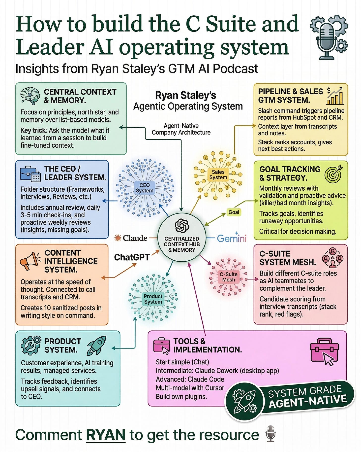 Ryan mapped out specialized AI agents across his entire business. The CEO operating system (what we’re building here) is the hub. Additional agents branch from it:
