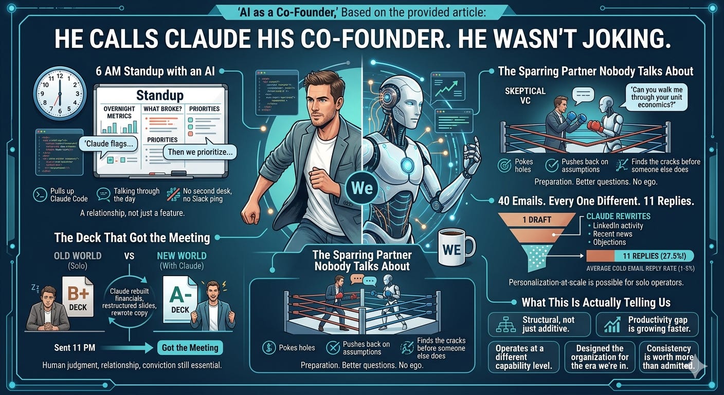 There’s real complexity buried in it. Human co-founders bring things Claude can’t — accountability, shared risk, judgment forged by failure, the ability to look you in the eye at 2am when everything is on fire and say we’re going to figure this out. That’s not nothing. That’s actually a lot.