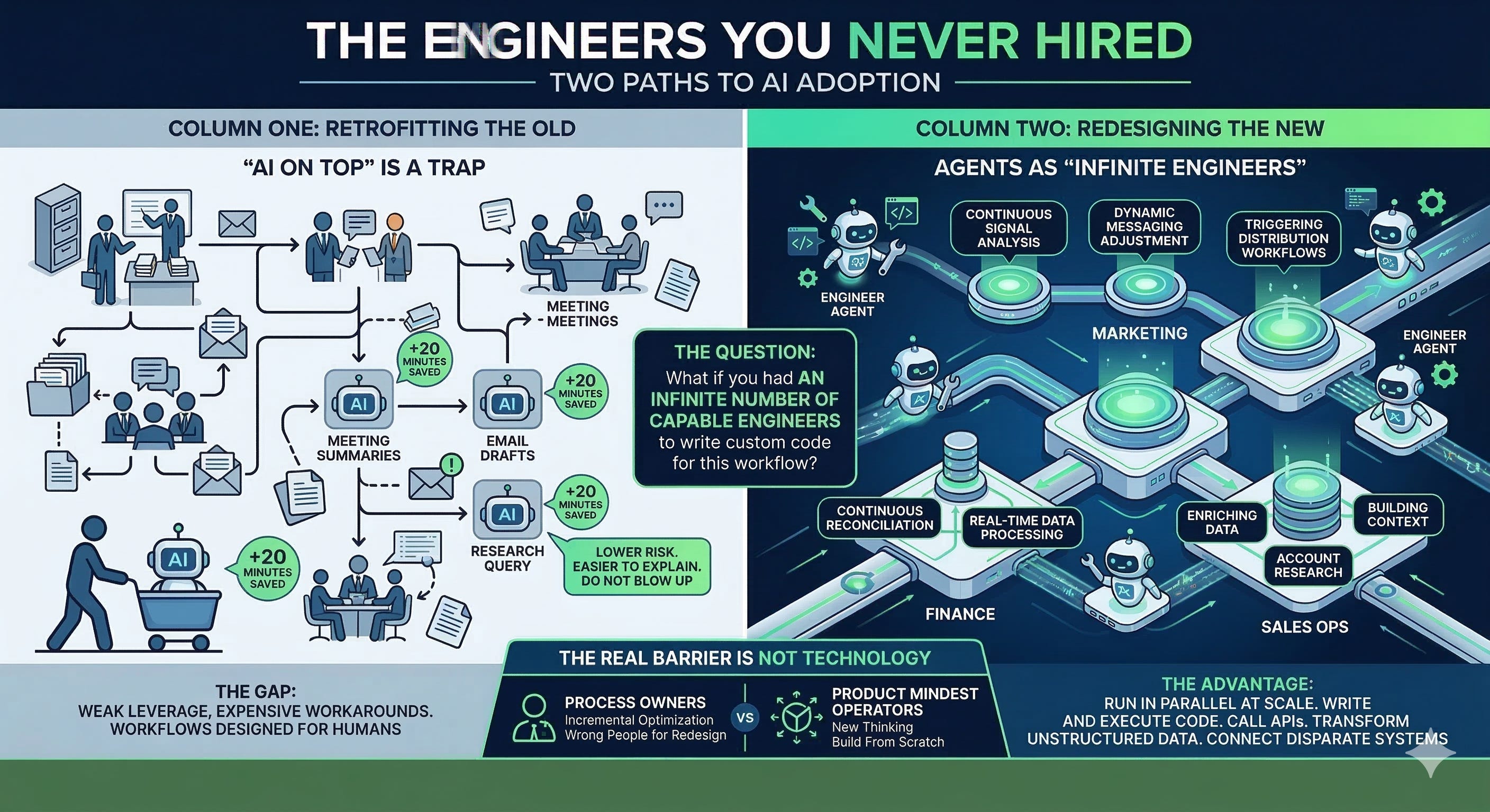 The redesign question requires a different kind of thinking. It requires someone who can look at a process and ask: “If I weren’t constrained by how we’ve always done this, and I had access to agents that could write and run code, what would I actually build?”