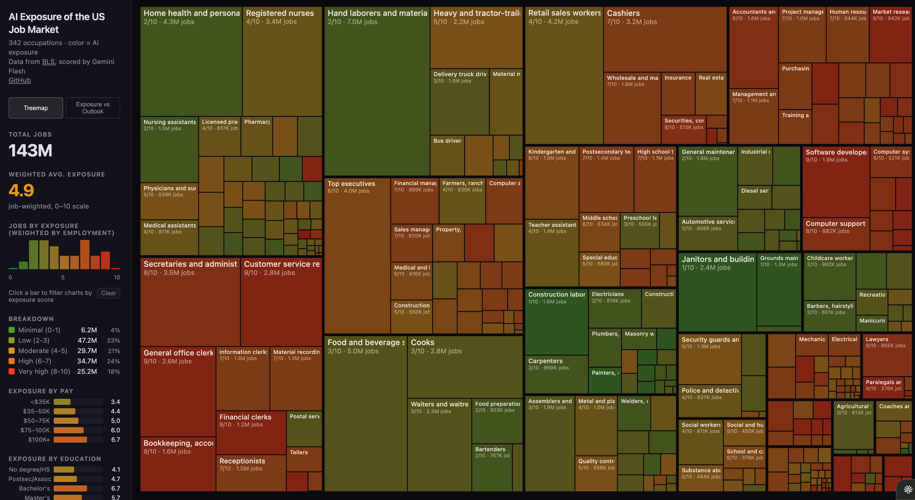 Andrej Karpathy (yeah, the former Tesla AI director and OpenAI founder) built something that should be required viewing for anyone with a salaried job. He analyzed every occupation in the US economy—143 million jobs total—and scored each one on AI exposure from 1 to 10, pulling data straight from the Bureau of Labor Statistics Occupational Outlook Handbook. You can see it yourself at karpathy.ai/jobs.