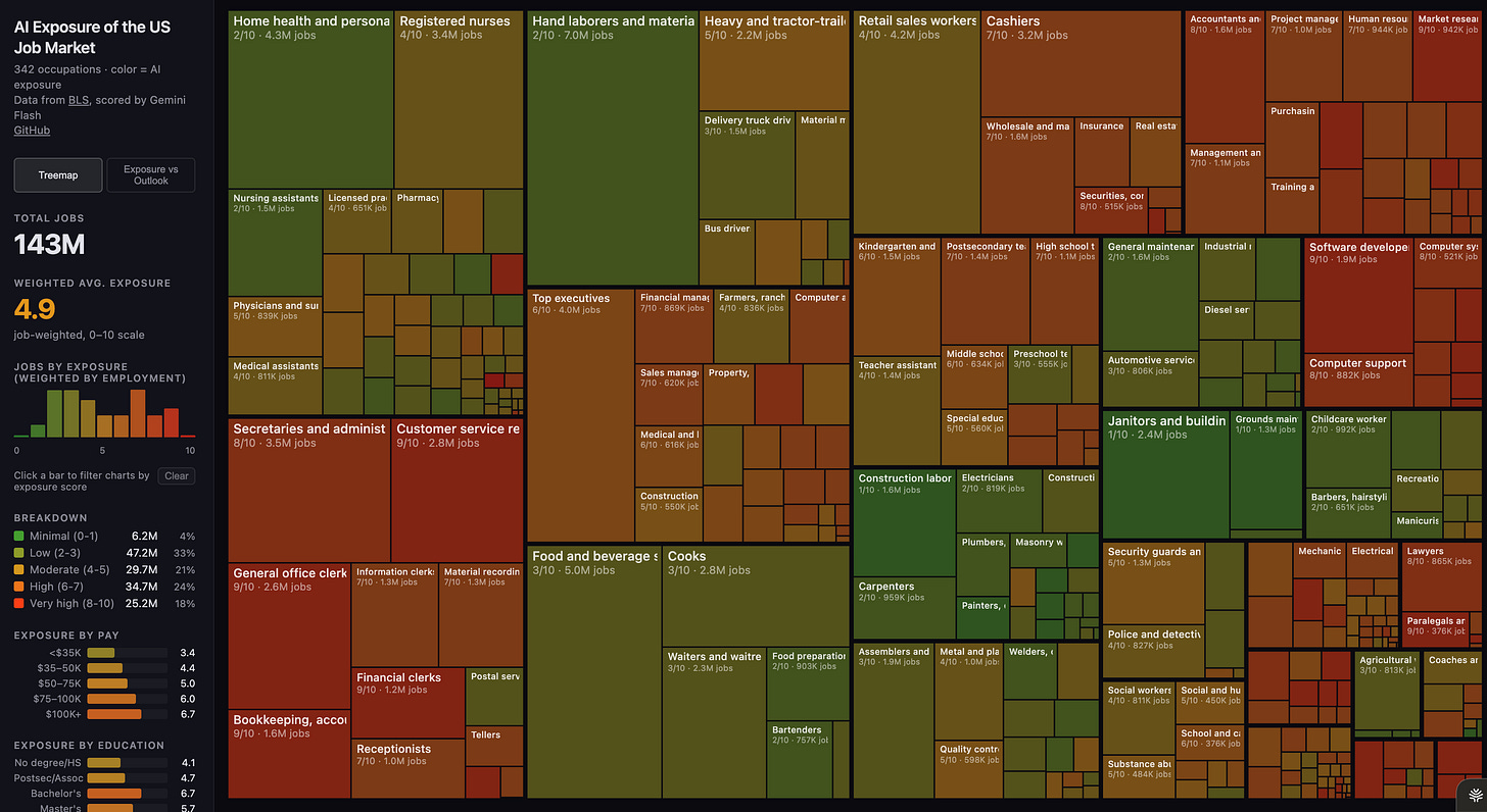 The heat map Karpathy built is the most honest version of that ground shift I’ve seen in a visual format. It’s not a prediction. It’s a description of structural vulnerability based on what these jobs actually require people to do.