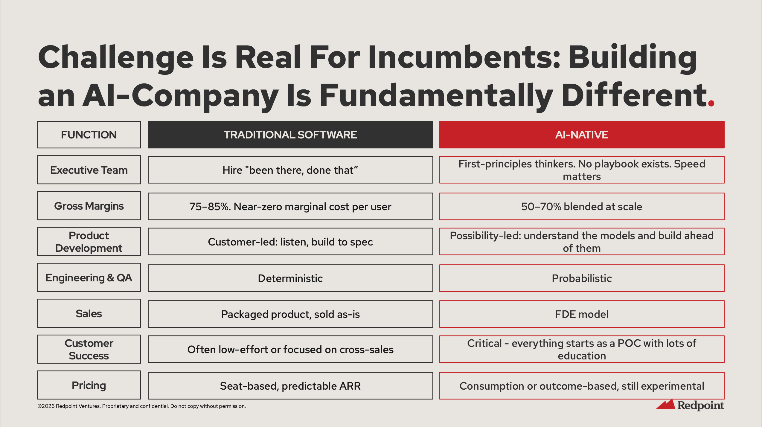 The most useful slide in Redpoint’s entire 60-page deck is page 43. It’s a simple two-column comparison: Traditional SaaS vs. AI-Native. I’ve stared at it for weeks now, and every time I look, I see a different failure mode in my own organization.
