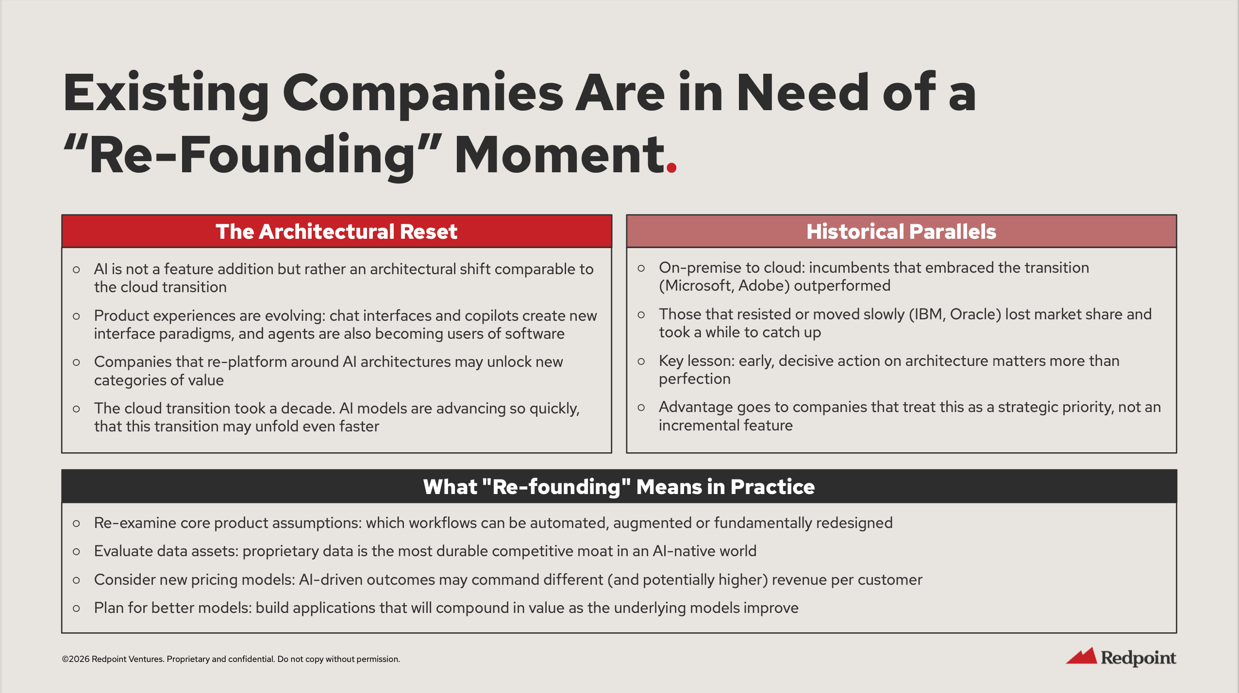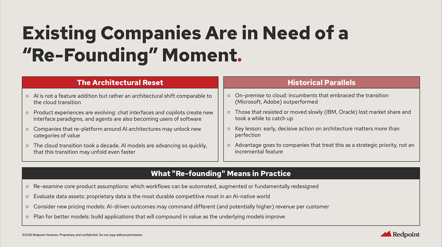 Redpoint frames this as an architectural shift comparable to the cloud transition. They point to historical parallels: Microsoft and Adobe embraced cloud and outperformed. IBM and Oracle resisted and lost share.
