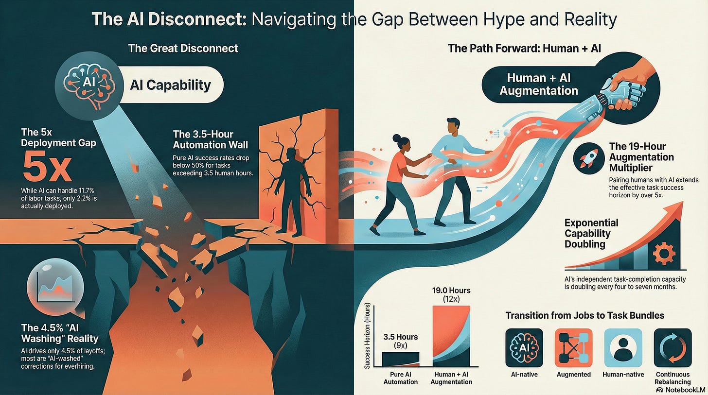 This resolves a huge piece of the tension between the perspectives. The frontier builders are right about capability — it’s enormous and growing. The economists are right about deployment — most organizations aren’t set up to capture it. The practitioners are right that it’s transformative — if you know how to pair human judgment with AI execution. And the reframers are right that the unit of analysis is tasks, not jobs.