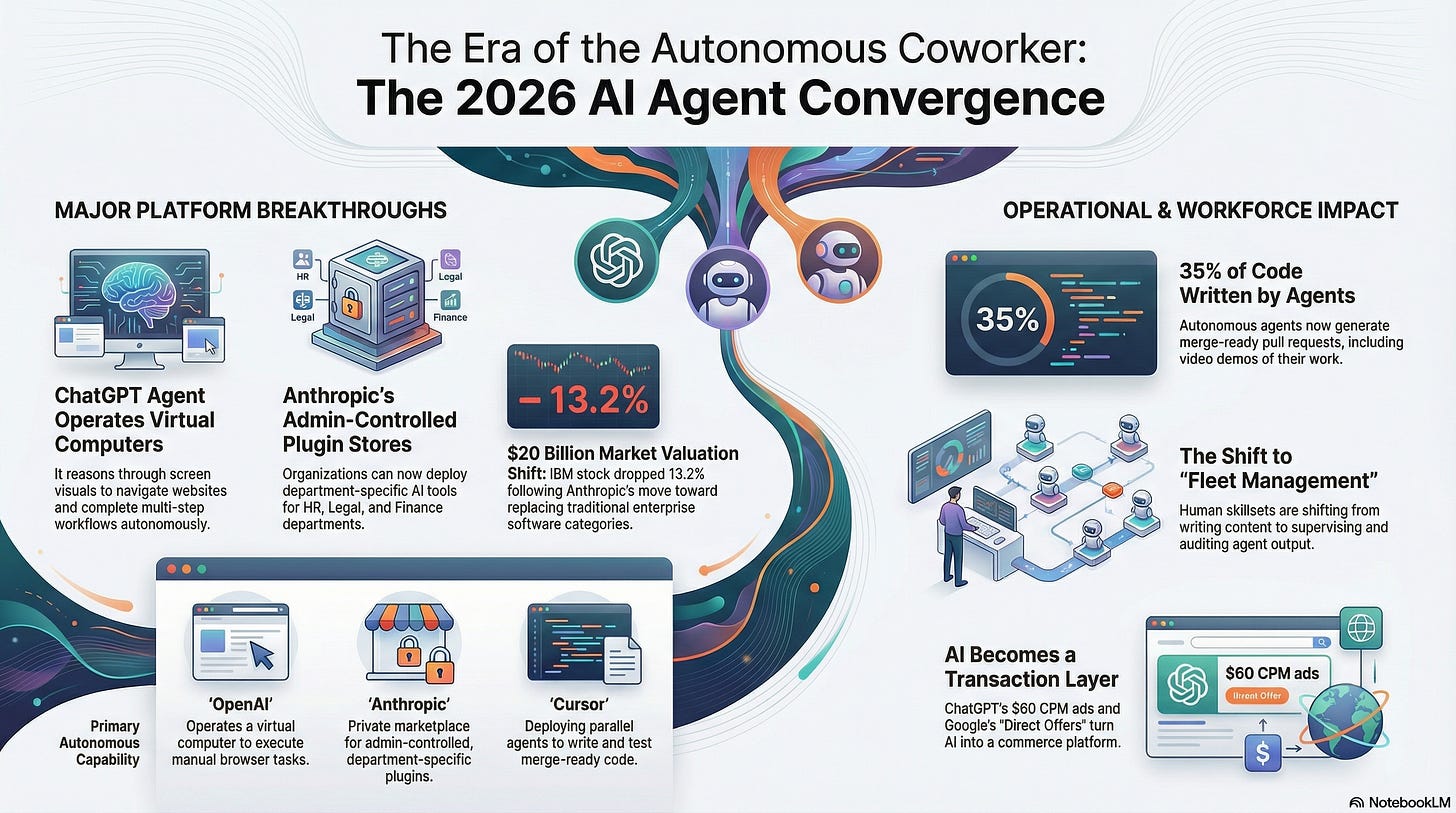 OpenAI merged three products into one agent that operates its own virtual computer. Anthropic launched an enterprise plugin marketplace that sent IBM’s stock down 13.2%. Cursor announced that 35% of its pull requests are now written by autonomous AI agents. Google shipped Gemini doing background tasks on Samsung phones. And ads landed inside ChatGPT at $60 CPM.