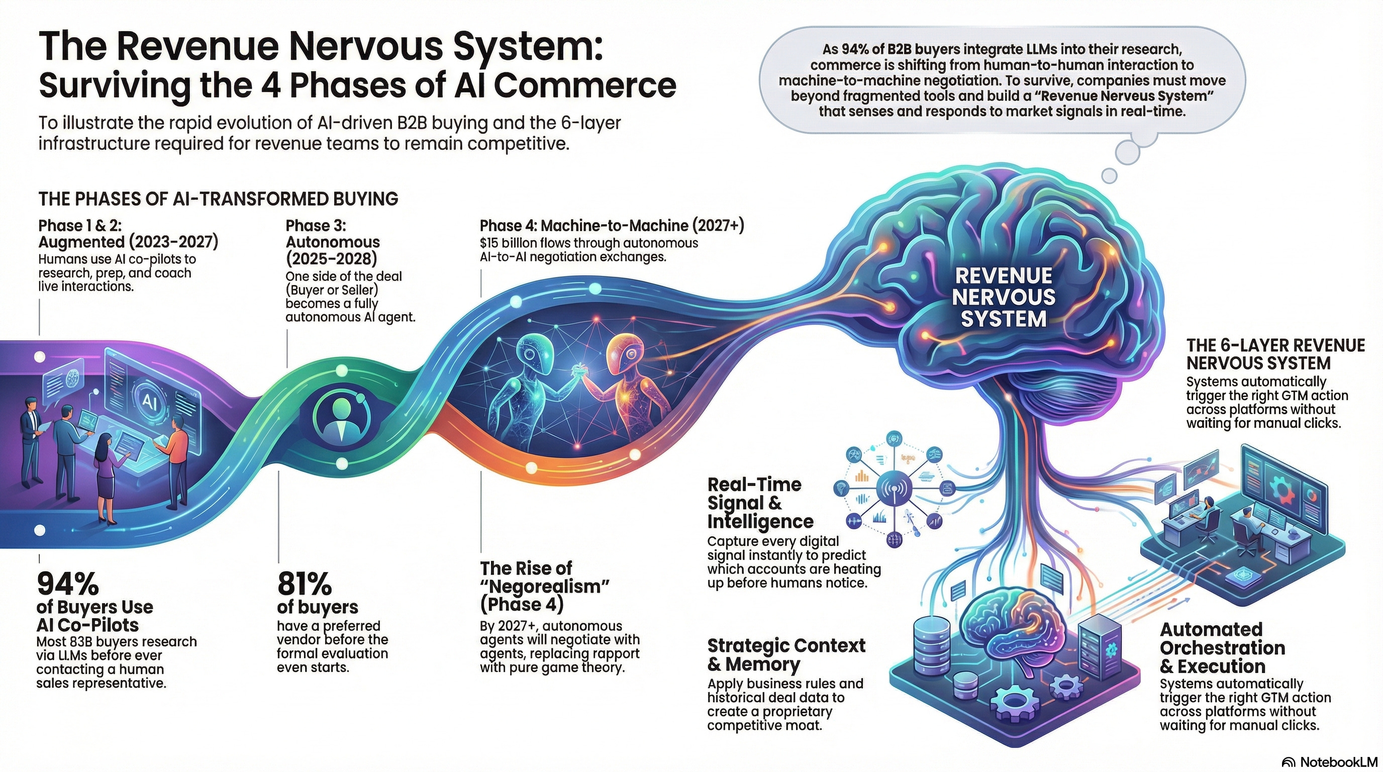 I spent the last few months building out a research framework I’m calling The Four Phases of AI-Transformed Buying. It maps the evolution from humans selling to humans, all the way to machines negotiating with machines. But the framework itself isn’t the insight. The insight is what it reveals about your infrastructure—and why the companies that win in every phase will be the ones who built their Revenue Nervous System before they needed it.