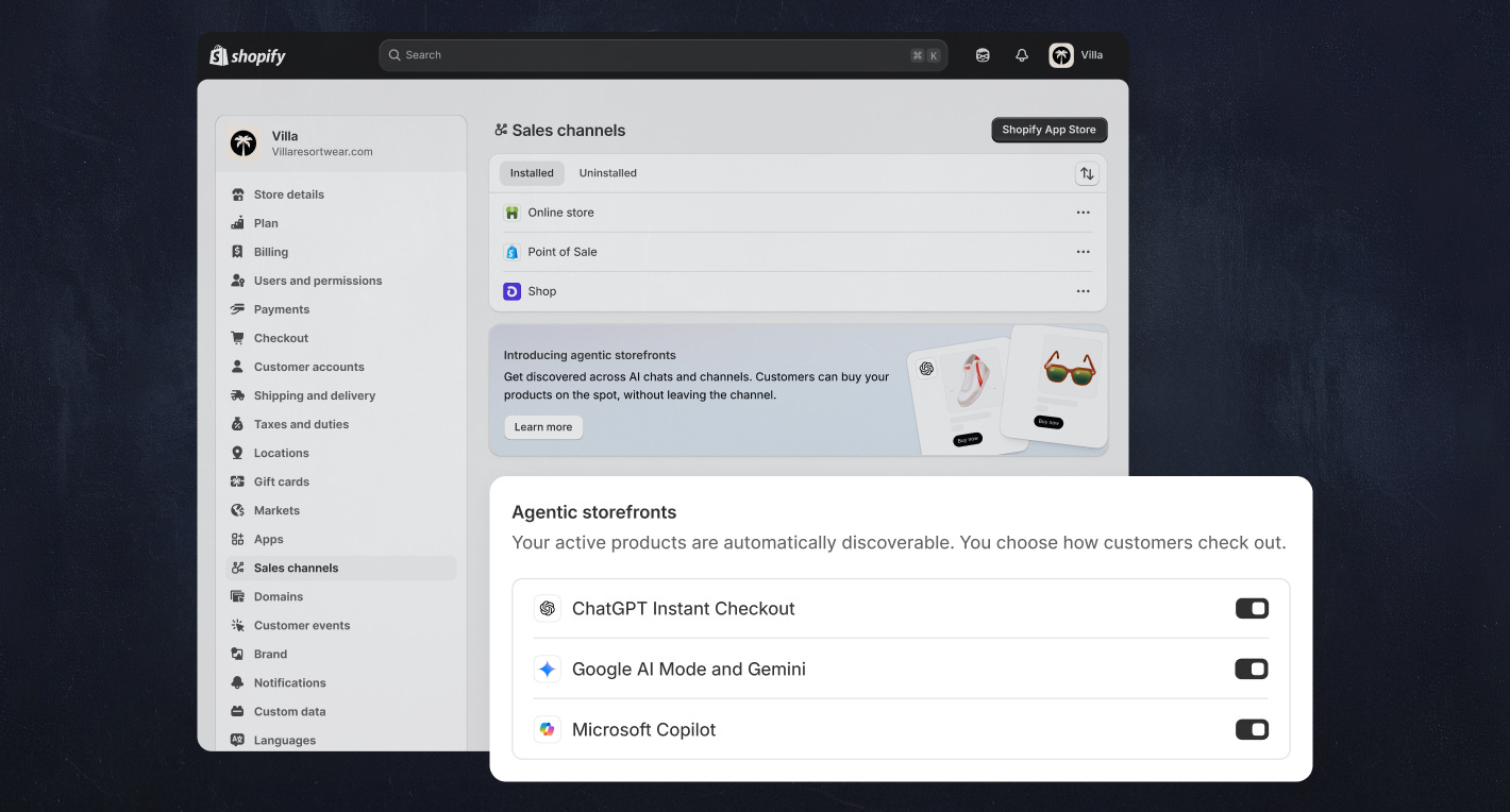 Shopify built what they call “Agentic Storefronts”—central management of AI channel distribution from their admin panel. Merchants set up their data once, and it surfaces across ChatGPT, Microsoft Copilot, Google AI Mode, and Gemini.